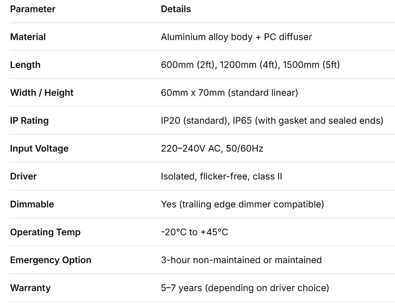 Material: Običajno ekstrudiran aluminij za odvajanje toplote, skupaj s polikarbonatnim difuzorjem. Obstajajo jeklene različice, vendar je aluminij zlati standard za ohranjanje hladne luči LED.