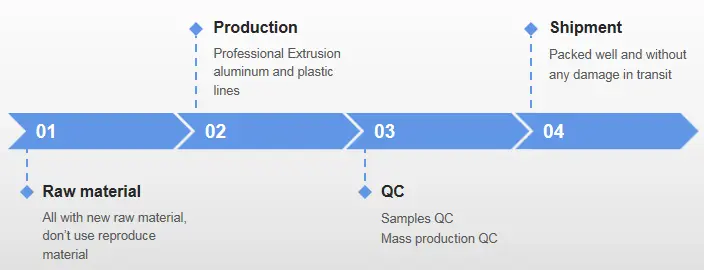 Kot profesionalni proizvajalec aluminijastih profilov LED in plastičnih profilov LED se JE vedno osredotoča na kvalifikacijo izdelkov od surovin iz aluminija in plastike do proizvodne linije za iztiskanje, od nadzora kakovosti vzorcev do nadzora množične proizvodnje, od močnega popolnega paketa do storitve celega srca.